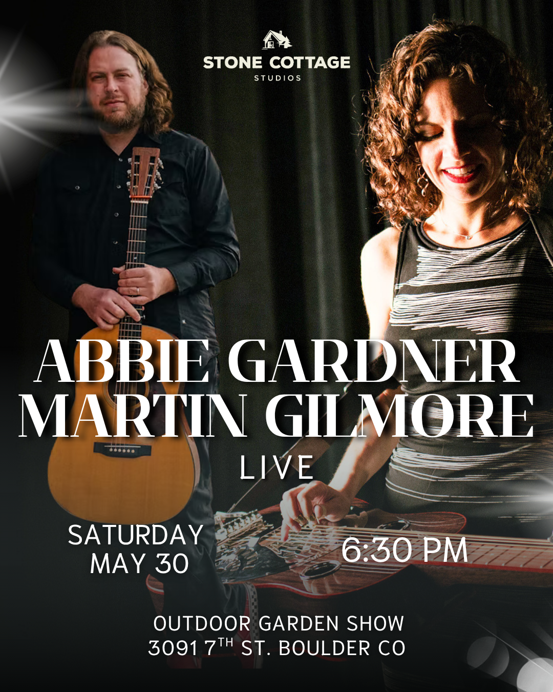 We are so excited to have highly acclaimed artists Abbie Gardner (of Red Molly) and Martin Gilmore with us at The Stone Cottage for an Outdoor Artist Series Concert on May 30th! You are in for a wonderful evening of music in the gardens at The Stone Cottage! Bring your low-back chairs/blankets, picnics and drinks of choice, and then kick back and relax for the show. The address for the outdoor series is 3091 7th St, Boulder. Doors - 5:30PM, Show - 6:30PM