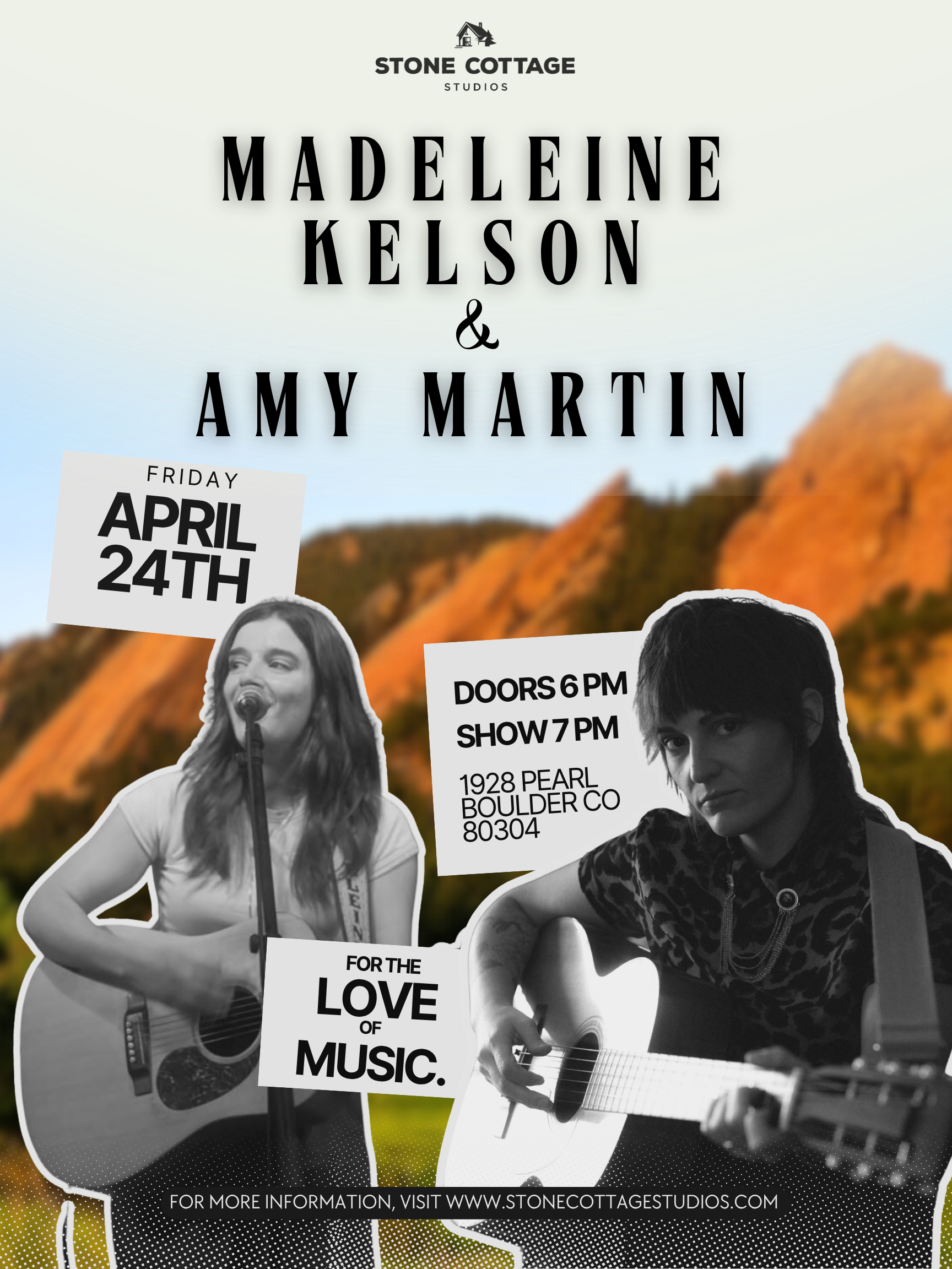 You are invited to an unforgettable music experience with there two amazing singer songwriters right here in the intimate listening space at Stone Cottage Studios! Join us for this intimate and exclusive concert in our historic downtown Boulder location at 1928 Pearl St. Mix and mingle then kick back and relax for the show. Doors - 6:00PM, LIVE - 7PM. Your Ticket Includes Inside access to Boulders Premier, Intimate Music Space, Meet and greet, Assortment of NA drinks or BYO of choice. Only 40 tickets available so grab your spot quick!